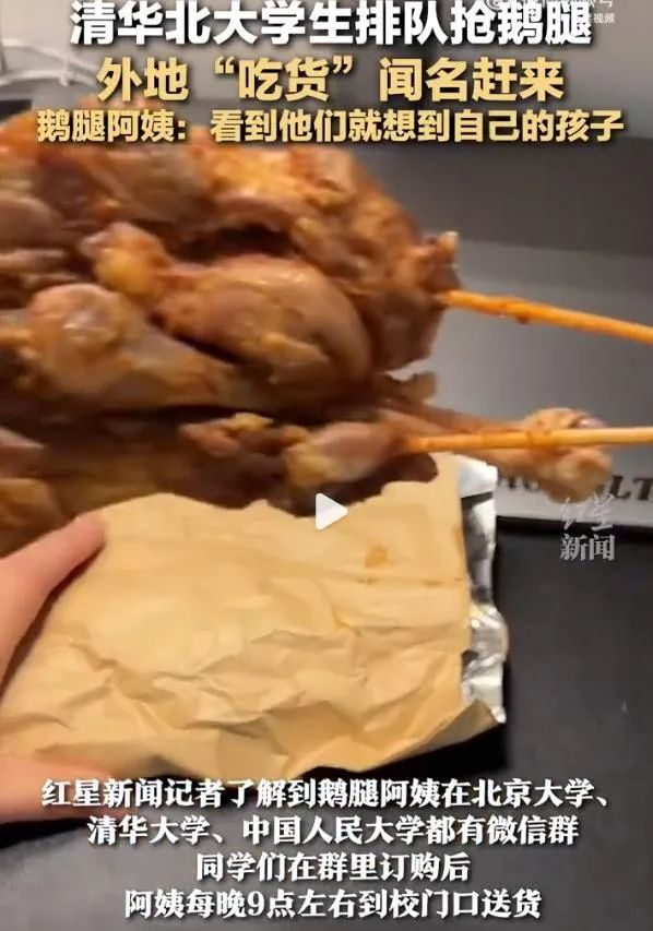 据红星新闻报道,鹅腿阿姨在北京大学、清华大学、中国人民大学都有微信群,同学们在群里订购后,阿姨每晚9点左右到校门口送货。