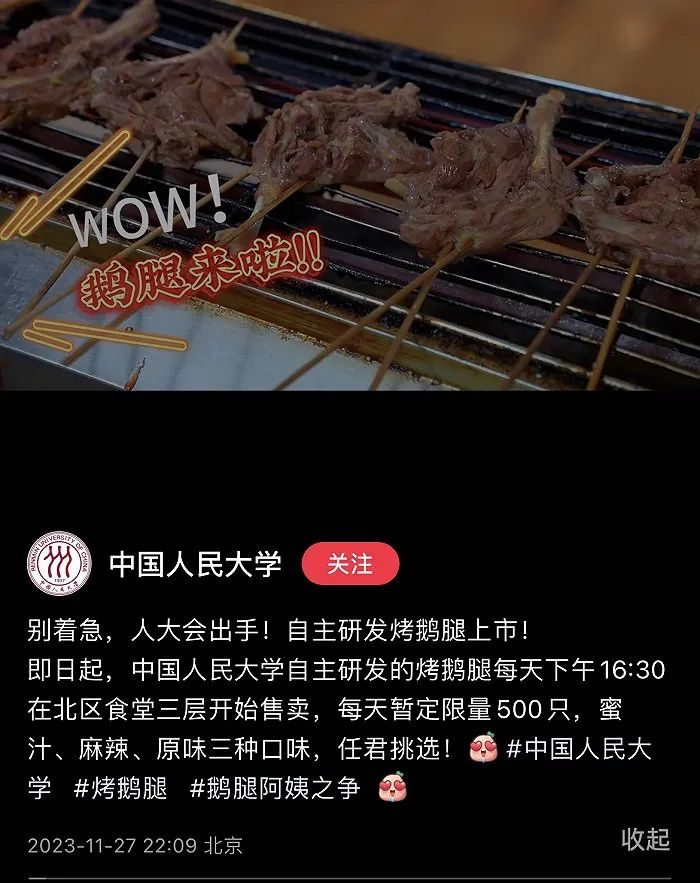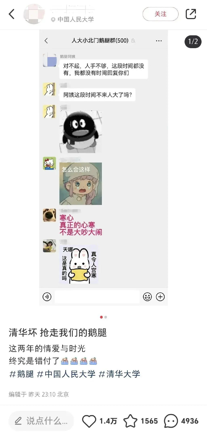事情的起因是一位原本在人大北大卖鹅腿的阿姨近期去清华摆摊了,北大、人大学子痛失鹅腿,以至于人大的同学纷纷破防。“两年的时光终究还是错付了。