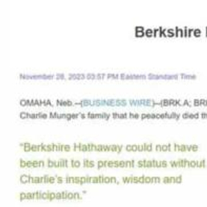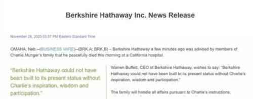 巴菲特在新闻稿中称,“如果没有查理的灵感、智慧和参与,伯克希尔-哈撒韦就不可能发展到今天的地位。”