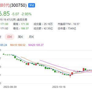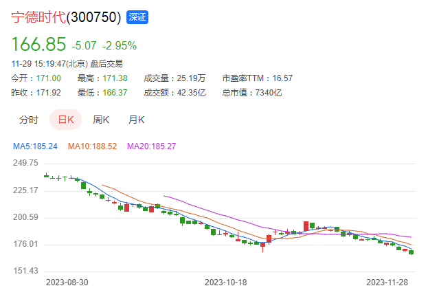 今天(11月29日),宁德时代股价收盘大跌2.95%,收盘价为166.85元每股,创下了两年半来的新低。