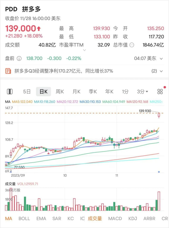 财报公布后,拼多多股价大涨18.08%至139美元,市值来到1847亿美元。同日,京东市值443亿美元,阿里巴巴市值1954亿美元,拼多多市值是前者的3倍以上,且不断逼近于后者。