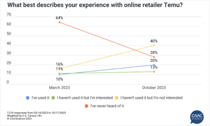 来自CivicScience在10月份进行的调查显示,美国消费者中,表示从未听说过Temu的受访者比例从64%下降到28%。也就是说,他们对Temu的认知度正在成倍增长。