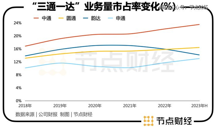 节点财经认为这反映了下游消费弱复苏导致的需求不足、以及快递产能阶段性过剩,各家快递公司为保持市场份额,不得不采取降价竞争策略所致。