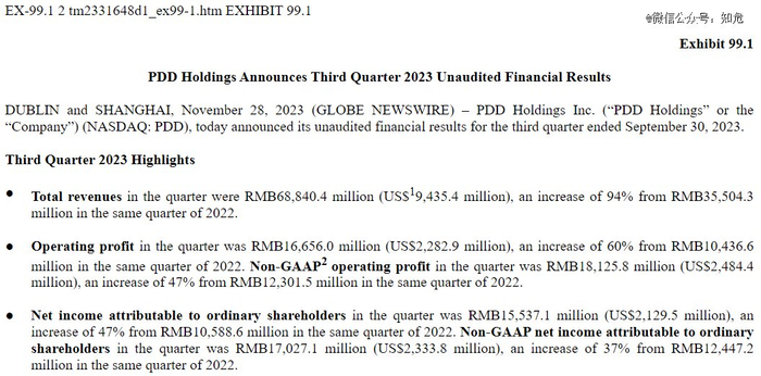 具体来讲,拼多多 2023 年第三季度的总收入为 688.4 亿元人民币,相较去年同期增长了 94% 。