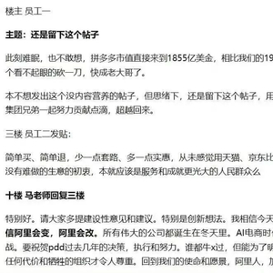 据说阿里员工们的回帖还是比较有凝聚力的,既然老板都带头称赞竞争对手了,对于拼多多这些年的崛起,在一线拼杀的淘天员工恐怕更知冷暖。