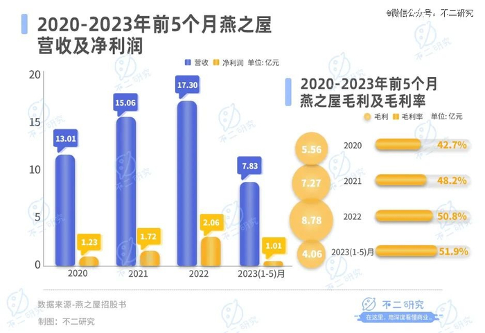 据招股书显示,2020-2022年及2023年前5个月,燕之屋营收13.01亿元、15.06亿元、17.30亿元和7.83亿元;净利润分别为1.23亿元、1.72亿元、2.06亿元和1.01亿元。