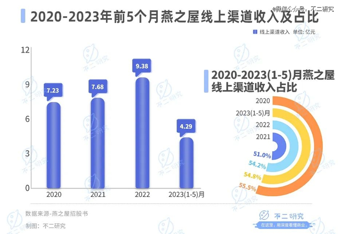 据燕之屋招股书显示,2020-2022年及2023年前5个月,其线上渠道的营业收入分别为7.23亿元、7.68亿元、9.38亿元和4.29亿元;营收占比分别为55.5%、51.0%、54.2%和54.8%。