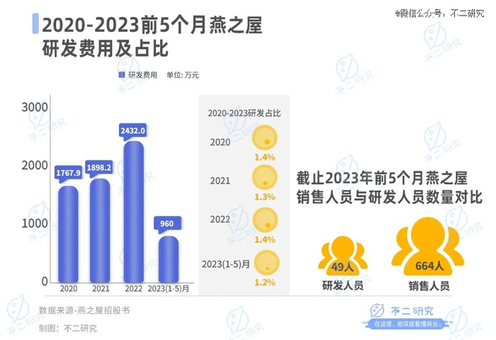 「不二研发」发现,燕之屋的营销费用、研发费用的倍数差异逐渐扩大。2020-2022年及2023年前5个月,其营销费用分别是研发费用的18.7倍、21.0倍、25.2倍、21.7倍。