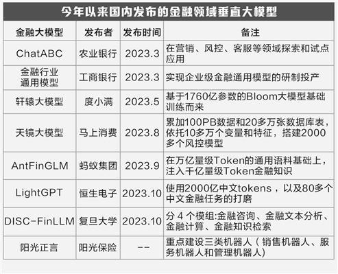 市场火热之下,今年国内金融领域垂直大模型竞相出炉。5月,度小满推出国内首个开源的千亿级中文金融大模型“轩辕”;8月,马上消费发布首个零售金融大模型“天镜”;9月,蚂蚁集团针对金融产业深度定制的金融大模型AntFinGLM亮相,并在集团内的财富、保险平台上内测;10月,恒生电子金融大模型LightGPT升级,在专业金融数据集、合规性要求和部署方式上实现突破,并宣布三款大模型应用产品开放公测。