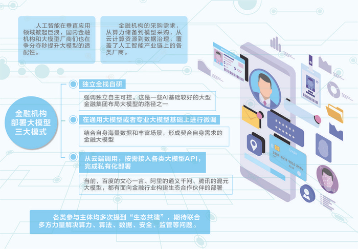 第三种,从云端调用,按需接入各类大模型API(应用程序编程接口),完成私有化部署。当前,百度的文心一言、阿里的通义千问、腾讯的混元大模型,都有面向金融行业构建生态合作伙伴的部署。