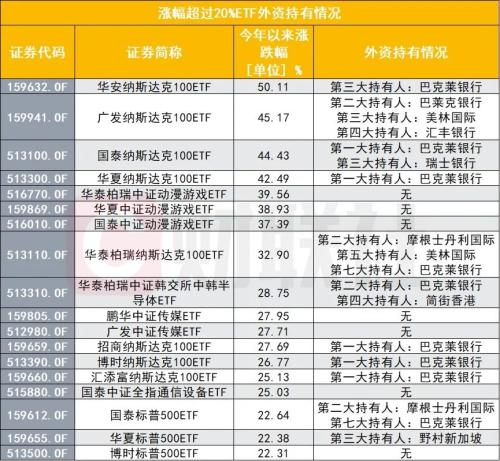 除了新发ETF,记者还注意到,外资机构也对绩优ETF青睐有加。Wind数据显示,截至11月28日收盘,共有18只ETF涨幅超过20%,其中便有11只产品的前十大持股人中出现了外资机构的身影,包括巴克莱银行、瑞士银行、摩根士丹利国际等。