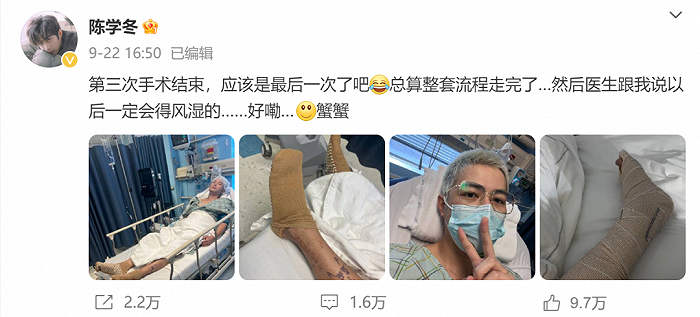 今年9月,陈学冬在社交媒体上分享了一组照片,宣布自己完成了第三次手术。