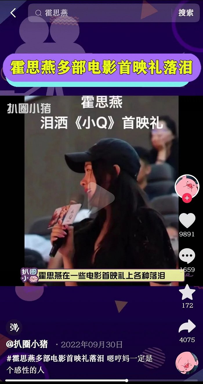 霍思燕则是以另一种方式活在了大众的手机里。网友总结出的电影短视频营销三板斧:吴京探班、张艺谋赞叹和霍思燕落泪,因为霍思燕经常在电影的首映礼感动落泪,经常刷脸已经被观众们记住。