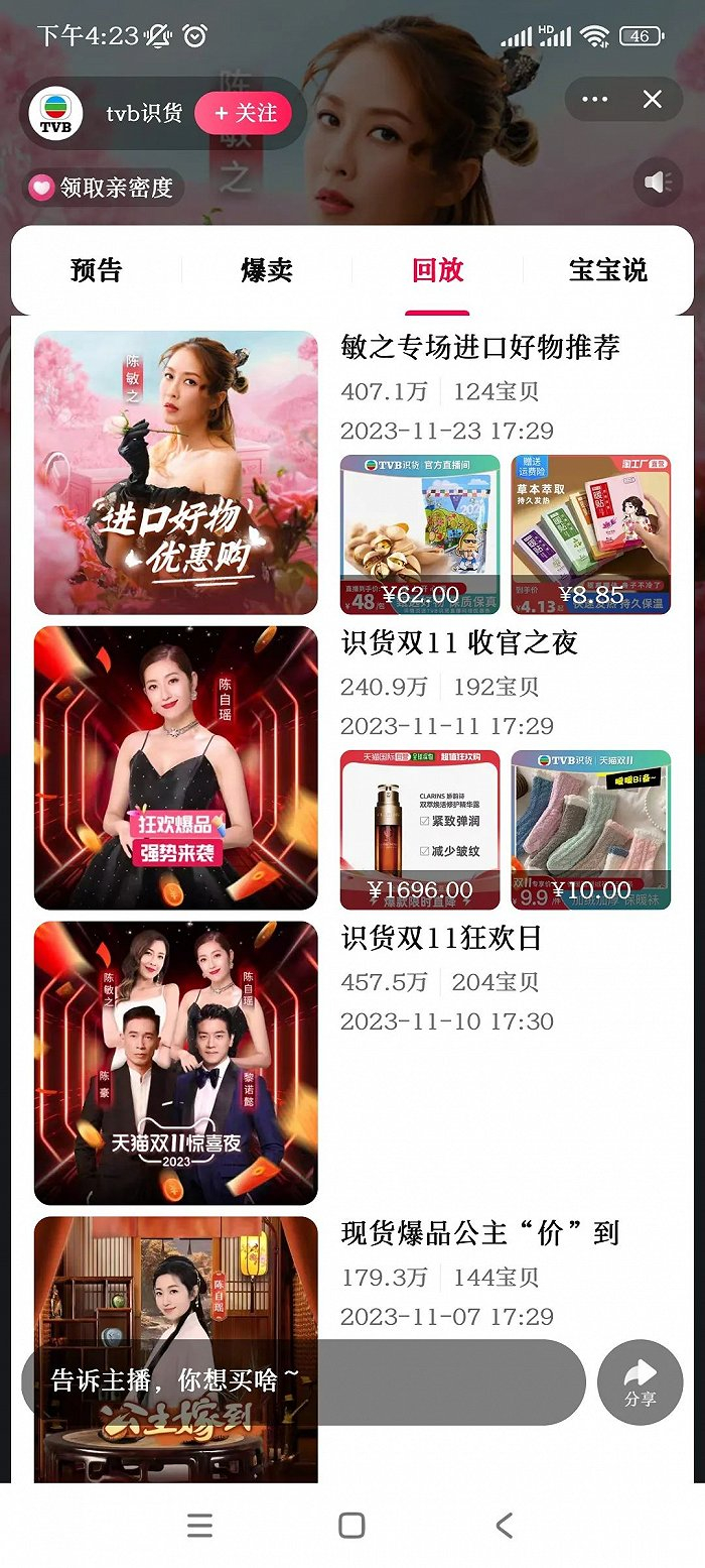 2022年4月,TVB就已宣布入驻抖音直播。2023年3月7日晚,TVB在淘宝直播开启直播带货,直播间累计观看人数超320万,累计观看人次超485万,首次带货2350万,成绩斐然。