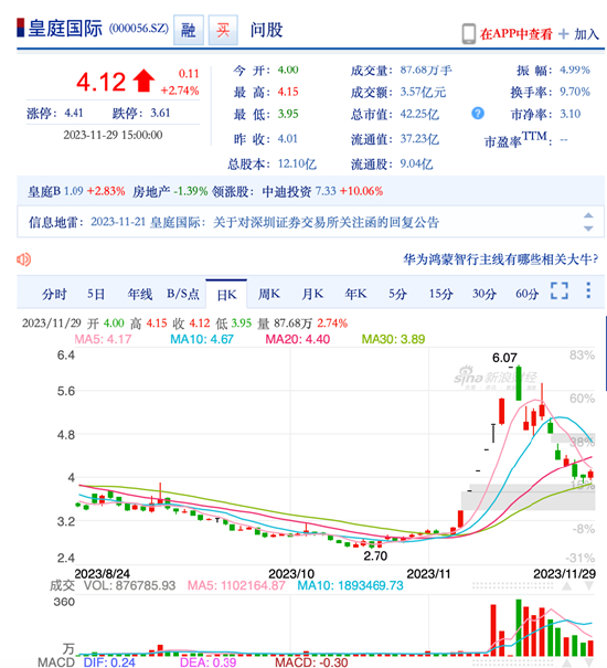 本月,皇庭国际曾连续走出7个涨停板,股价从3.09元/股涨至6.02元/股,涨幅接近95%。不过,连板行情后,对皇庭国际的炒作却骤然熄火,公司股价随即下跌。11月29日收盘价为4.12元/股,相较最高峰已回撤近四成。