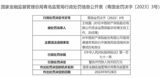 时任中路财险资金运营部副总经理主持工作、总经理王桂磊对中路保险借用通道变相自行开展高风险领域投资事项负有责任,被青岛监管局罚款4万元。