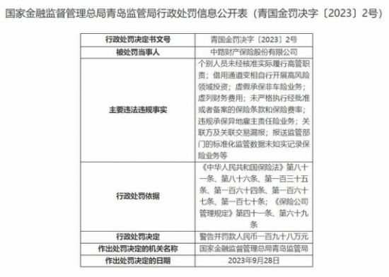 值得一提的是,今年9月28日,中路财险被青岛监管局开出百万罚单。文件青国金罚决字〔2023〕2号显示,中路财险因存在个别人员未经核准实际履行高管职责;借用通道变相自行开展高风险领域投资;虚假承保非车险业务;虚列财务费用;未严格执行经批准或者备案的保险条款和保险费率;违规承保异地雇主责任险业务;关联方及关联交易漏报;报送监管部门的标准化监管数据未如实记录保险业务等8项违法违规事实,被青岛监管局处以198万罚款。