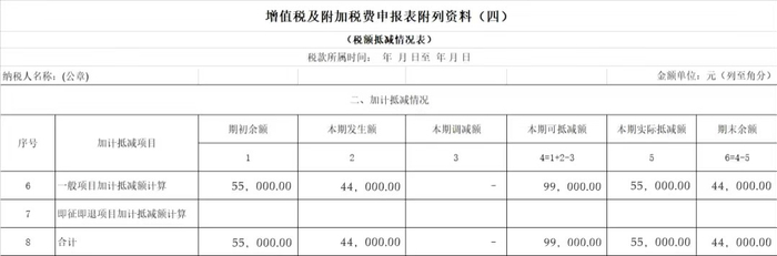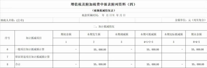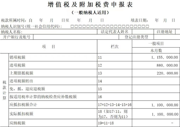 注意:根据《增值税及附加税费申报表(一般纳税人适用)》及其附列资料填写说明,适用加计抵减政策的纳税人,19栏按以下公式填写:第19栏“一般项目”列“本月数”=第11栏“销项税额”“一般项目”列“本月数”-第18栏“实际抵扣税额” “一般项目”列“本月数”-“实际抵减额”,即19栏=115.5-110-5.5=0。