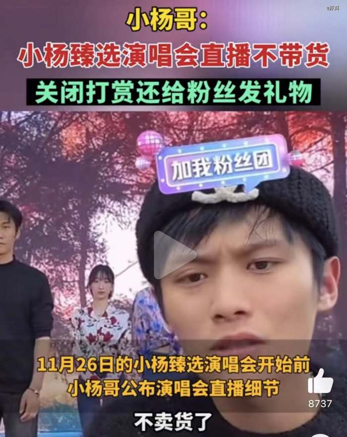 此前,小杨哥放话:演唱会主要想回馈粉丝的支持,不仅不卖货,还准备了几十台电瓶车、手机、冰箱、平板等*礼品,在直播间送给观众,而且当晚会关掉礼物打赏功能。