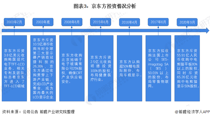 京东方通过兼并收购的方式实现迅速的扩展,从2003年2月开始实施收购兼并战略,收购韩国现代电子TFT-LCD业务,从而进入到TFT-LCD领域;2003年12月,京东方再次通过收购当时作为全球第二大显示器产销商冠捷科技的26.36%打通上下游产业链,完成LCD产业整合,成为国内最大LCD显示企业。
