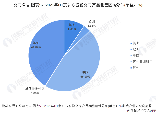 在区域销售方面,京东方科技集团股份有限公司产品市场主要在亚洲,另外美洲和欧洲也有部分市场。2021年上半年,中国地区实现销售收入占比为46.10%;亚洲其他国家及地区实现销售收入占比为0.09%;美洲和欧洲销售收入占比为9.41%和3.36%。