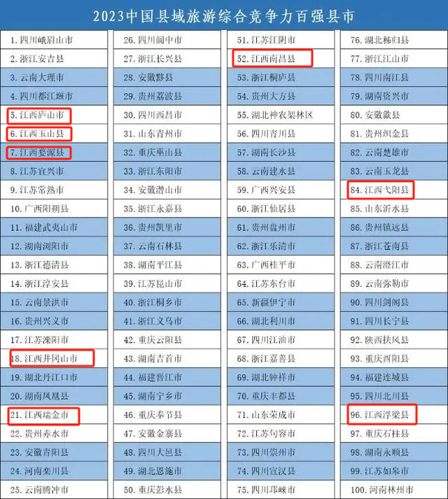 江西8个县市上榜2023中国县域旅游综合竞争力百强,分别是庐山市、玉山县、婺源县、井冈山市、瑞金市、南昌县、弋阳县、浮梁县。