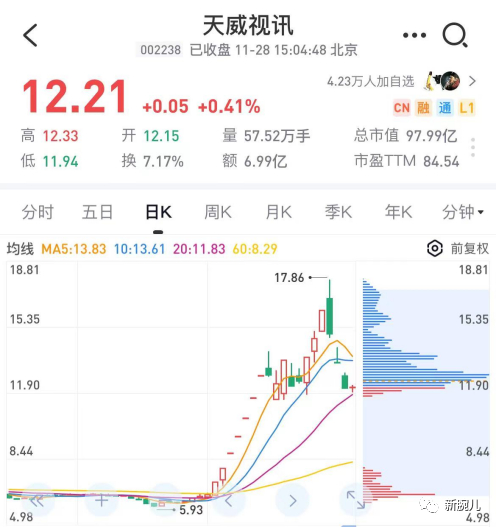 接连三个跌停板,短剧界小太阳天威视讯在11月28日报收12.21元/股,微微上涨0.41%。