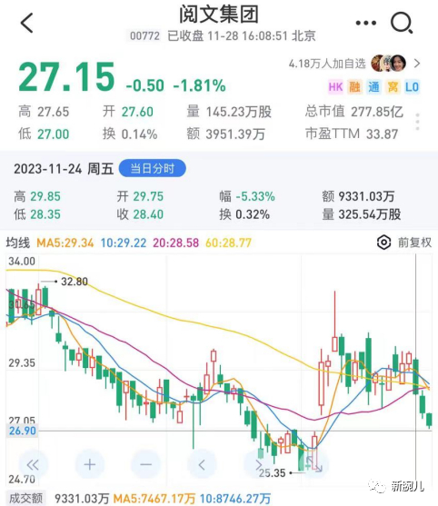 据雪球数据,11月24日,阅文在线股价下跌5.33%,报收28.4元/股,而后两天,仍延续下跌的趋势,分别下跌2.64%和1.81%,截至目前报收27.15元/股。