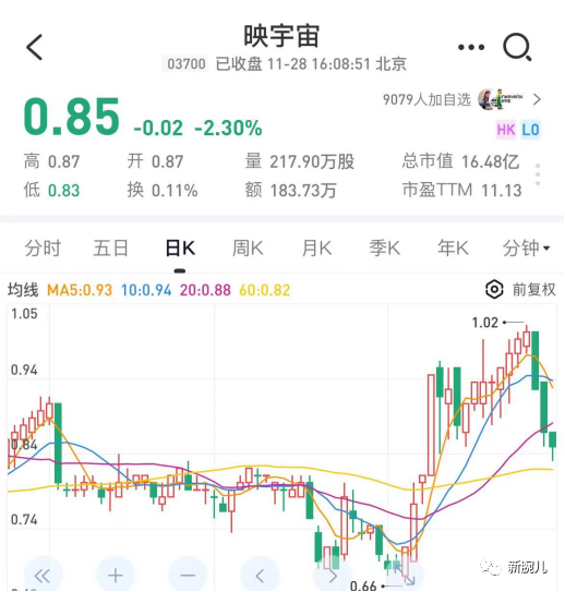 11月24日、27日,到28日,连续三天,映宇宙跌去近15%以上,股价只剩下8毛。