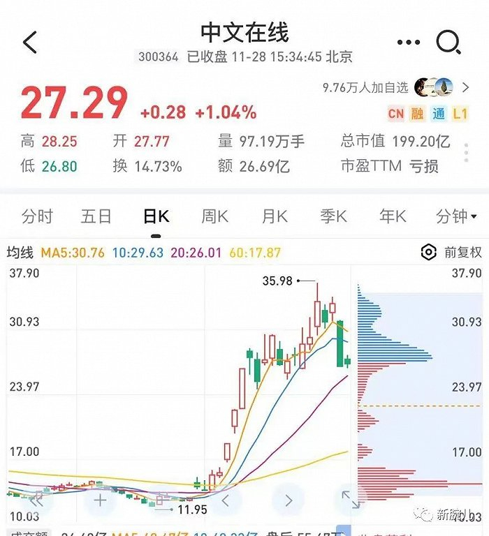 中文在线股价一天跌去19.97%,报收27.01元/股。
