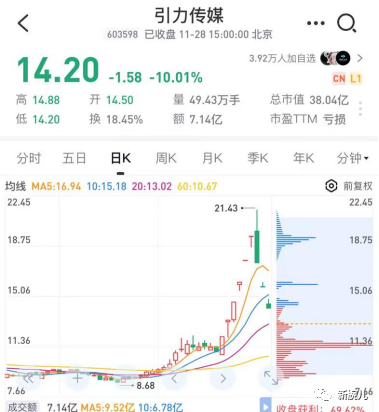 在11月15日,引力传媒报收11元/股,后来的6天,连续6个涨停板后迅速跌停。