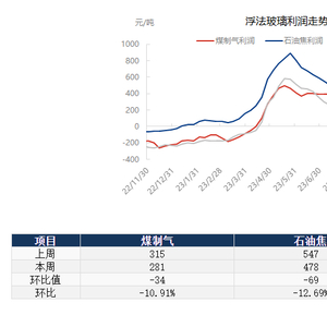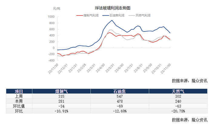 数据显示,据隆众资讯生产成本计算模型,本周(11月24-30日当周)以天然气为燃料的浮法玻璃周均利润240元/吨,环比下降63元/吨,以煤制气为燃料的浮法玻璃周均利润281元/吨,环比下降34元/吨;以石油焦为燃料的浮法玻璃周均利润478元/吨,环比下降69元/吨。