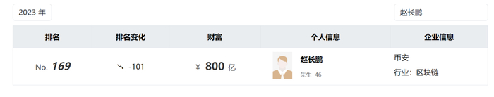 此前,根据2023年《胡润全球富豪榜》,赵长鹏身家就只剩800亿,早已从“华人首富”位置跌落。