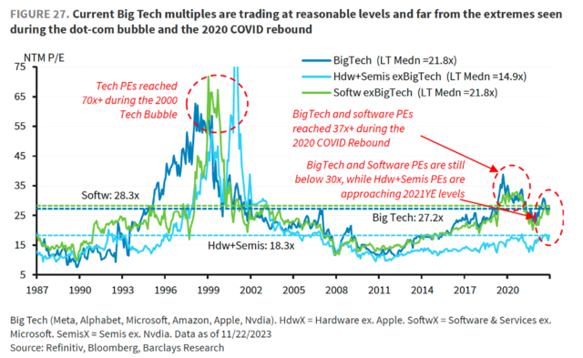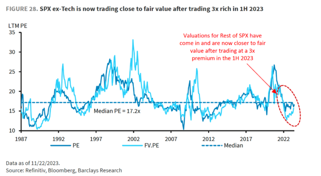 巴克莱认为,通过对标普500的估值和价格进行了评估,认为其在2024年存在适度的上行潜力,同时,尽管科技股的估值超过了标普500的其他公司,但依旧看好科技股的上涨空间: