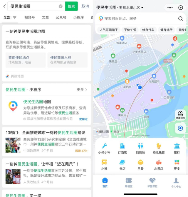 今年7月,商务部等13部门联合发布《全面推进城市一刻钟便民生活圈建设三年行动计划(2023-2025)》,明确提及“推广'小修小补'便民地图,引导更多点位'进图'”,提出重点发展“一店一早”、补齐“一菜一修”、服务“一老一小”。为响应号召,微信与腾讯地图基于“小修小补”主题地图,升级上线了全国首张“一刻钟便民生活圈地图”。