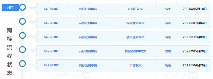 值得注意的是,该申请的初审被驳回过一次,通过复审方始通过。不知是否由于其它公司对初审公告提出异议造成的。