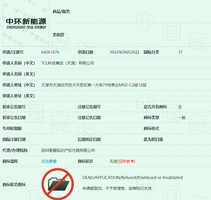 有意思的是,除了积极防守之外,TCL天津还发起了进攻,对第37个大类发起关于“中环”、“中环光伏”、“中环新能源”的商标注册申请,不过均被驳回。第37大类主要是建筑服务等,这正是中环控股的老本行——建筑和房地产。