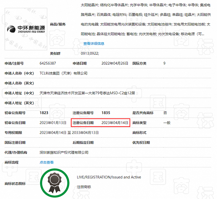 国家商标局公开信息显示,TCL天津在2022年4月26日才对“中环新能源”这个商标发起申请,在今年4月14日注册申请通过。