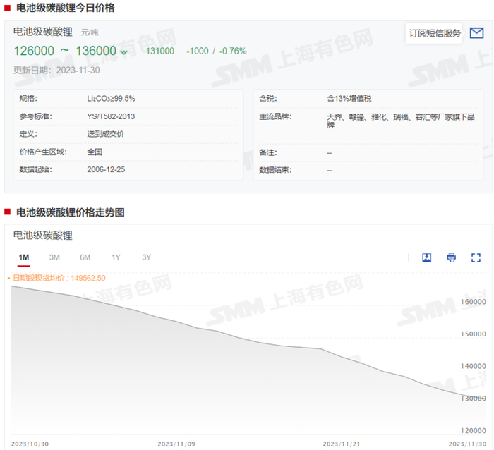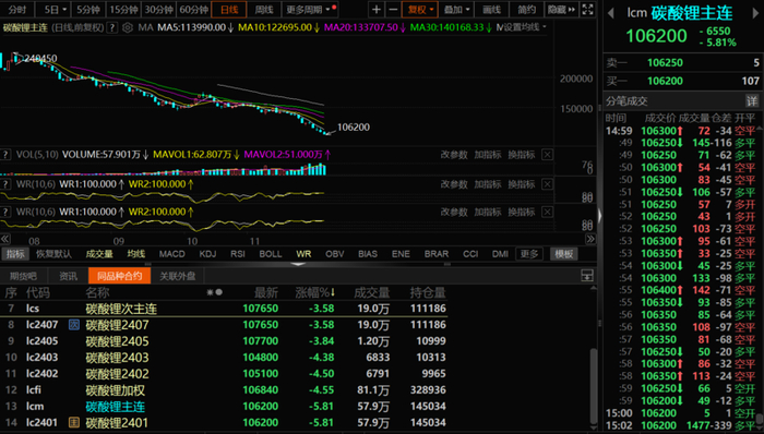 SMM 11月30日讯:近日,碳酸锂期货价格的持续下跌,且屡屡刷新上市新低的情况,引发市场热议。11月30日,碳酸锂期货主连更是在收盘之际大幅下跌5.81%,报106200元/吨。