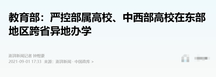 “从严控制高校异地办学。不鼓励、不支持高校跨省开展异地办学,特别是严控部委所属高校、中西部高校在东部地区跨省开展异地办学,原则上不审批设立跨省异地校区。”