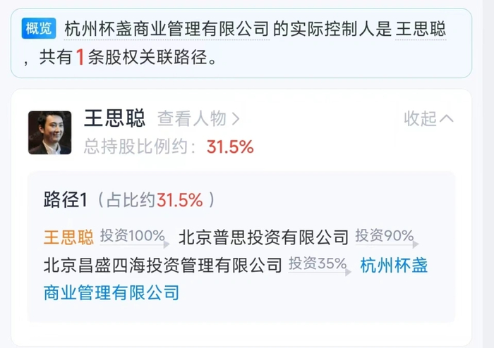 值得注意的是,天眼查APP显示,王思聪为杭州杯盏实际控制人,总持股比例为31.5%。