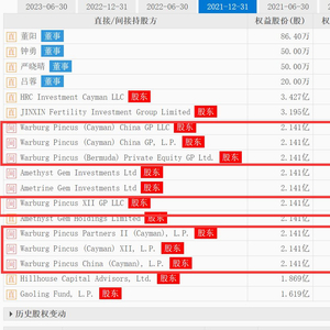 对这笔投资,华平投资也迎来了丰厚回报。截至2022年6月,华平投资旗下多只基金已消失在锦欣生殖前十大股东中。而在2021年底,华平投资(Warburg Pincus)旗下多只基金还持有大比例股份,对应权益股份超14亿元。