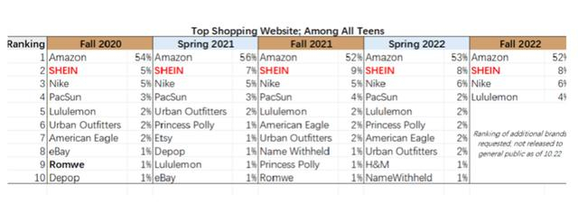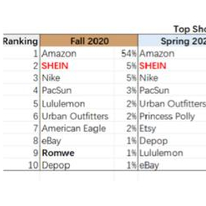 值得一提的是,SHEIN已经不是第一次入围该榜单。自2020年起,SHEIN即已连续多年入围且排名与票数占比仍在不断攀升。最新的2023年秋季数据显示,不论是在美国年轻人最喜爱的购物网站还是最喜爱的服装品牌中,SHEIN的排名仍在靠前发展。