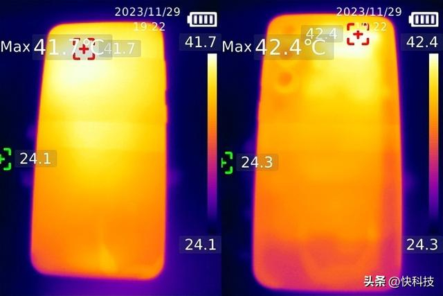 虽然功耗比较高,但机身的温度却没有想象中的那么高,机身正面最高只有41.7摄氏度,背面也才42.4摄氏度,游戏过程中几乎不会感觉到烫手,只是有一些温温的感觉。