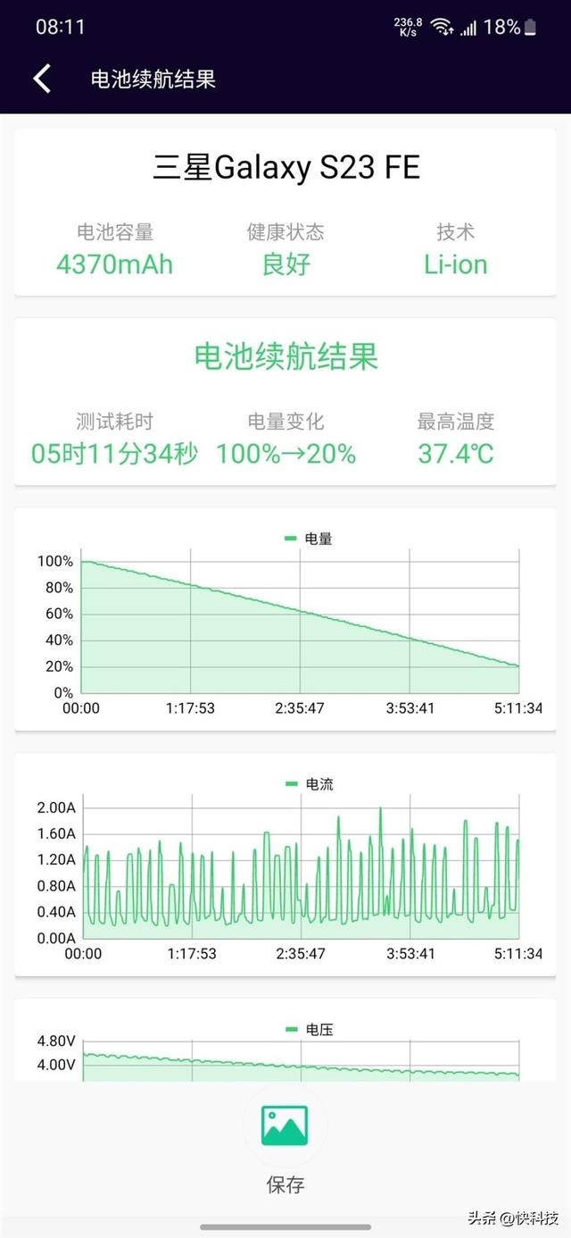 经过电池狗狗的不间断测试,三星Galaxy S23 FE的电量从100%测试至20%,续航时长为5小时11分34秒,经过折算,满电续航时长大约在6.5小时左右,间歇性使用的话,大概能用个大半天。