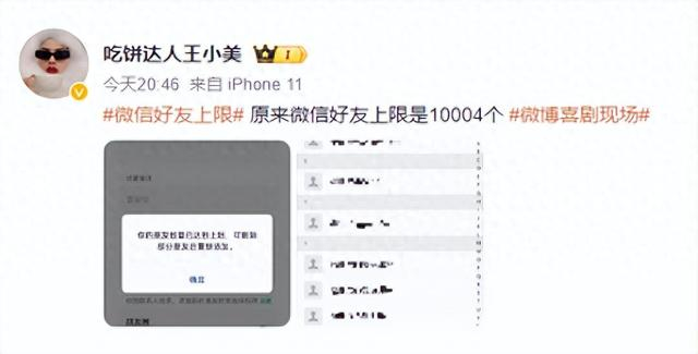 网友“吃饼达人王小美”今晚发文称,通过自己的实测,微信好友上限是10004个。