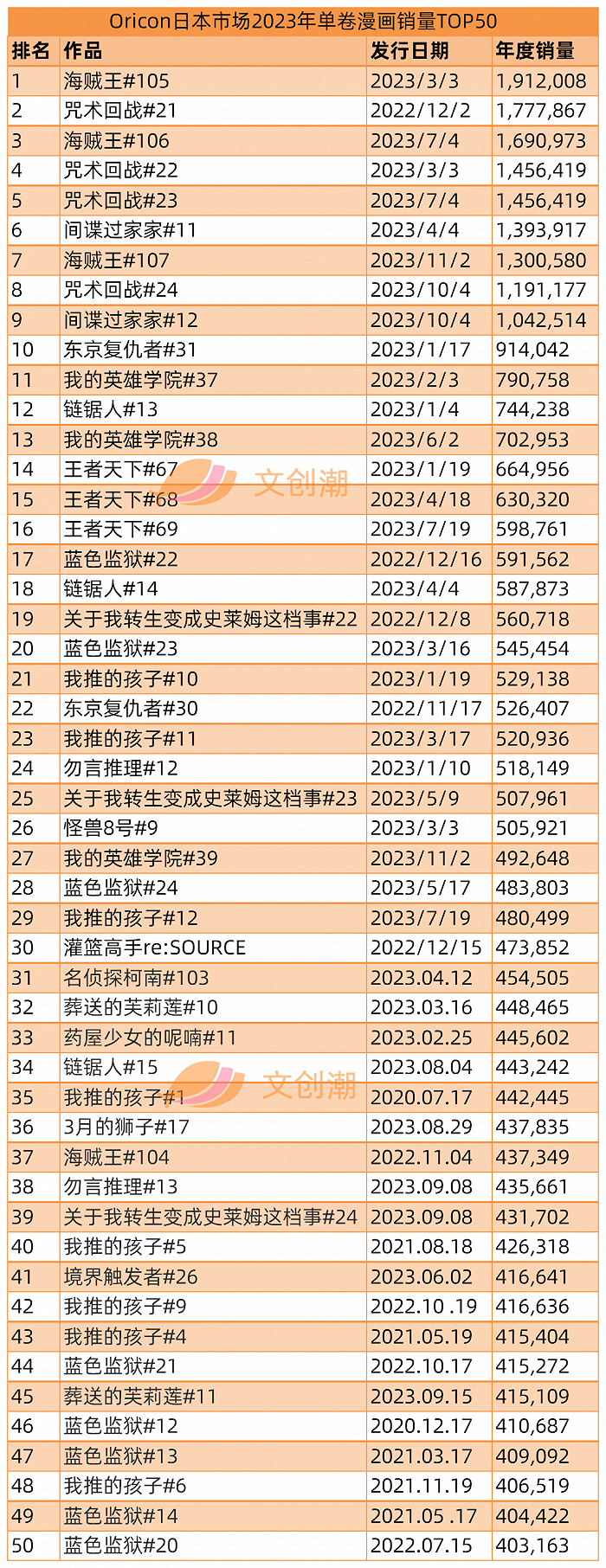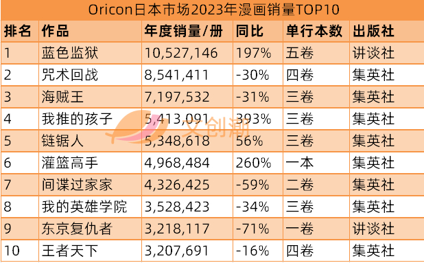 其中,漫画系列的TOP10分别为:蓝色监狱、咒术回战、海贼王、我推的孩子、链锯人、灌篮高手、间谍过家家、我的英雄学院、东京复仇者、王者天下。