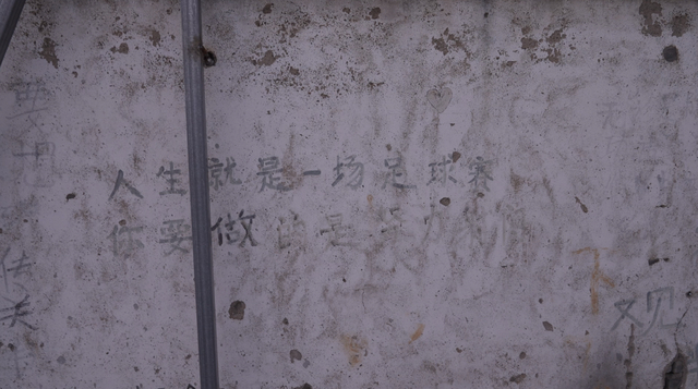 队员们在白墙上写的标语:人生就是一场足球赛,你要做的就是用力射门。