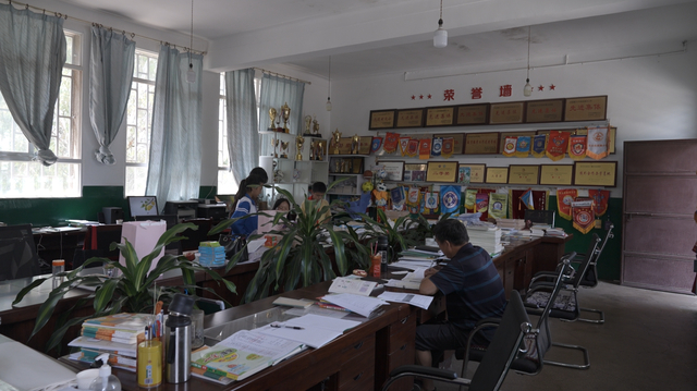 教师办公室摆了一墙的足球队荣誉证书和奖牌。