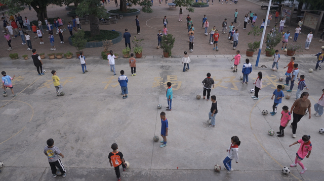 在老球场旁的人造草皮小球场,低年级的学生正在这里排队练习运球动作,学校的语文老师和数学老师努力地维持着队伍秩序。何国成介绍,这所“大山”里的学校人手不够,需要她们帮忙带带低年级训练。